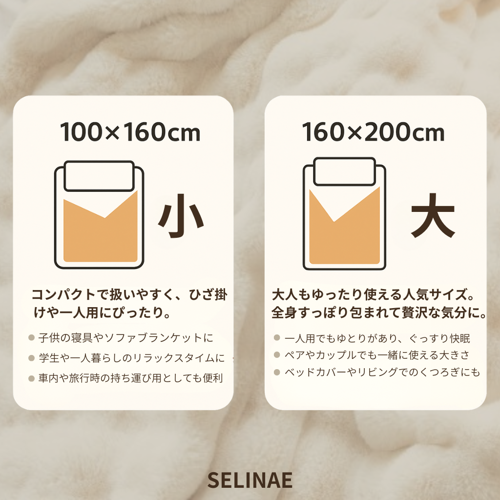 ソファやひざ掛け用には100×160cm、ベッドやしっかり包まれたい方には160×200cmがおすすめです。