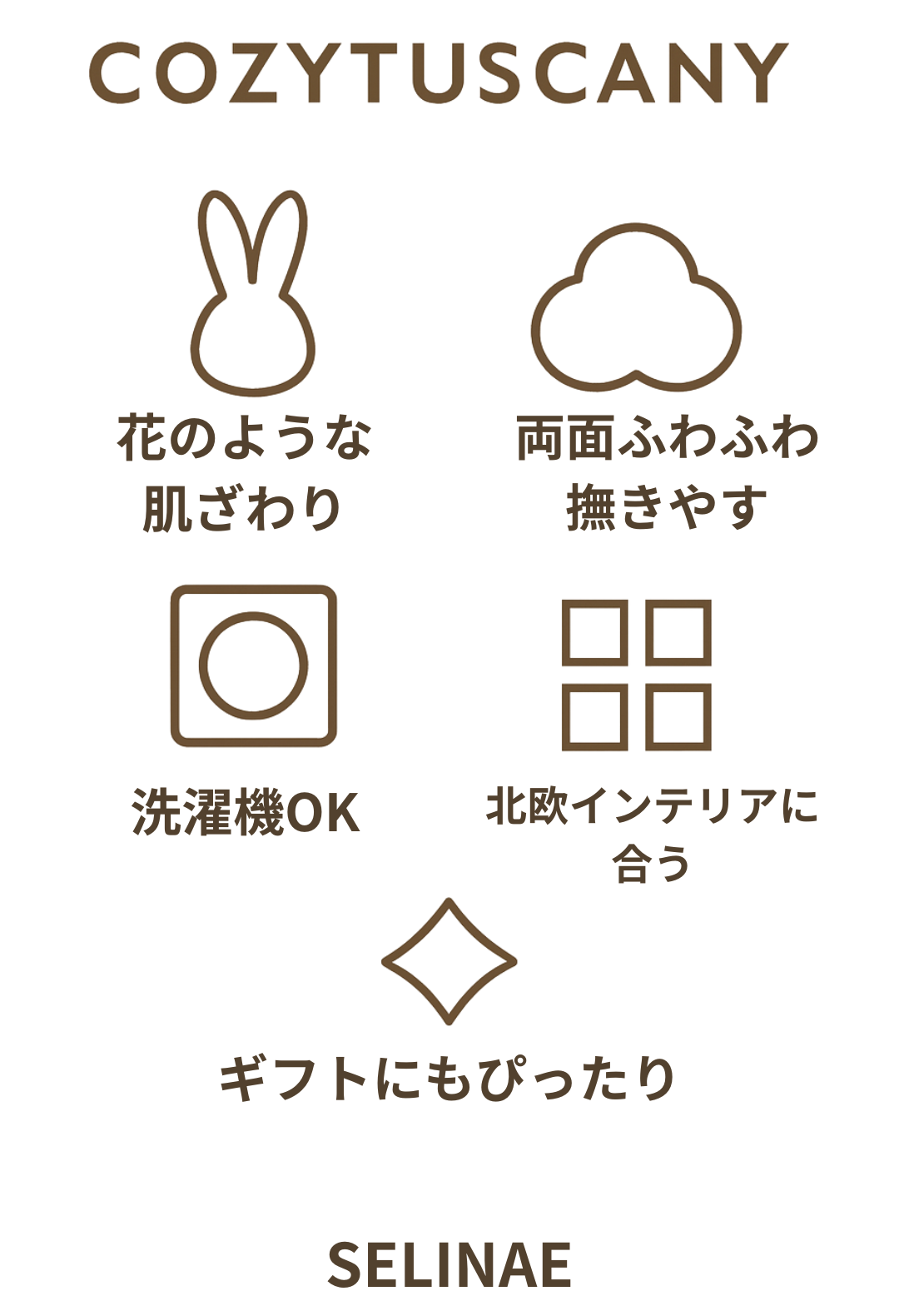 両面にふわふわのバブルベルベットを使用し、触れた瞬間から心まで包み込まれるような心地よさをもたらします。
